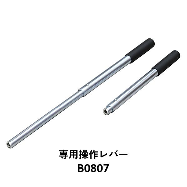 ジャッキには専用の操作レバーが付属しています。操作性を高めるため、太めの丸パイプを採用し、握り部分にはゴムグリップがついています。2本のパイプをロック機構により接続する形状になっているので、収納時にはコンパクトになります。