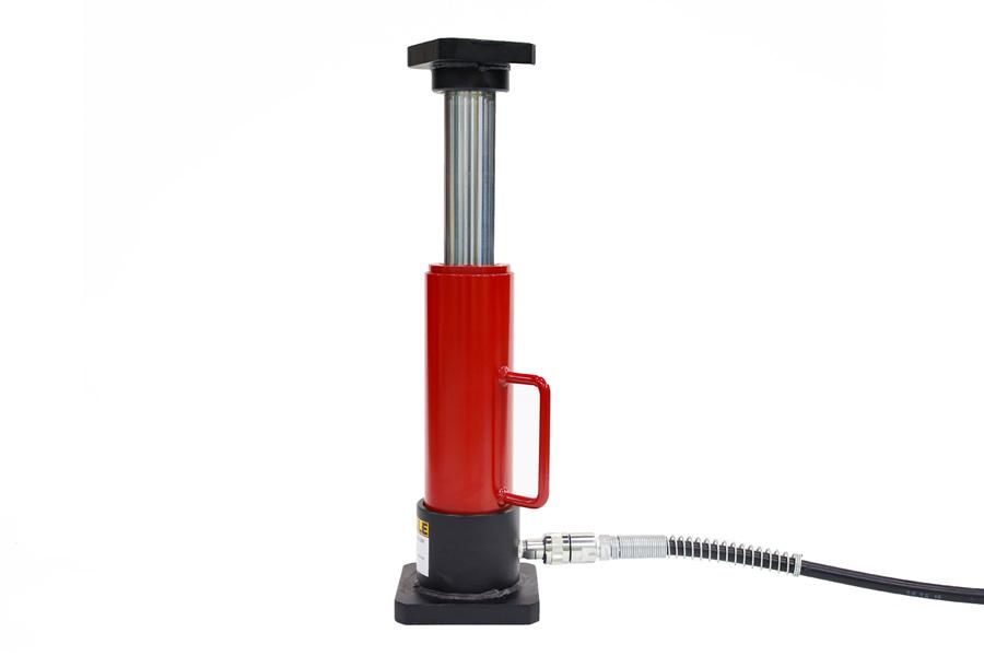 本ジャッキは高圧ホースで外部ポンプと接続して使用するタイプです。従来の爪付きジャッキのようなポンプ一体型と異なり、ホースを介することで、ワークから離れて作業することができるので、非常に安全です。