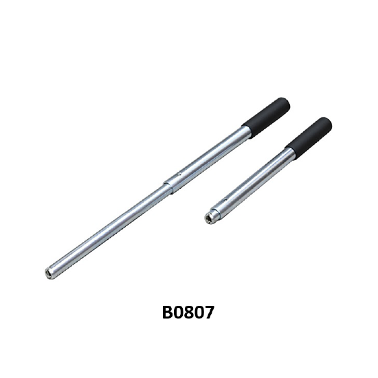 ・ジャッキには専用の操作レバーが付属しています。操作性を高めるため、太めの丸パイプを採用し、握り部分にはゴムグリップがついています。2本のパイプをロック機構により接続する形状になっているので、収納時にはコンパクトになります。