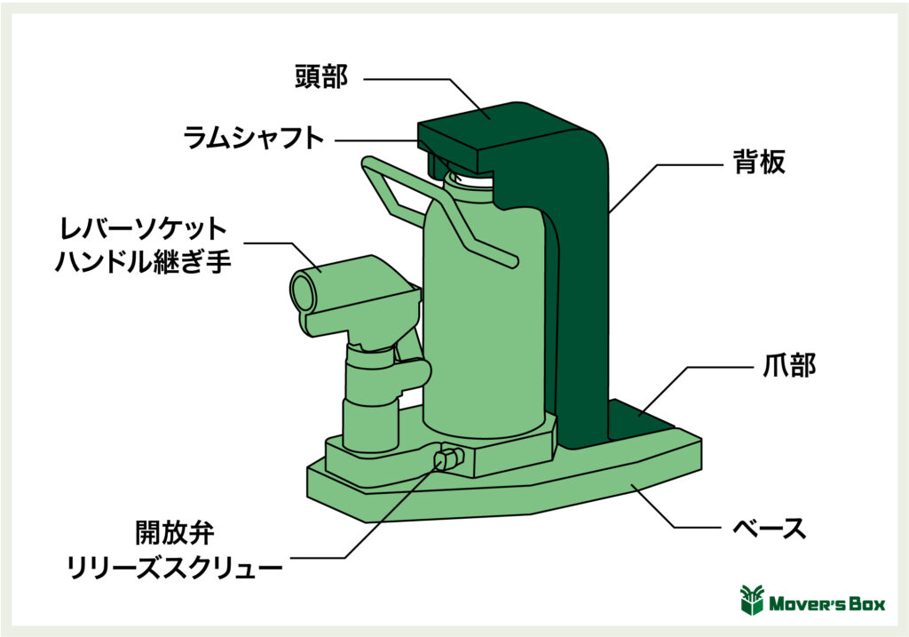 使い方に入る前に、まずは簡単にジャッキの各部名称についておさらいしましょう。呼び方についてはメーカーにより異なりますが、構造・機能は基本的に同じです。