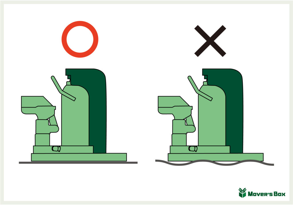 重量物を持ち上げるのに、傾いた場所や軟弱な地面の上で使用するのは大変危険です。地盤が不安定だと、ジャッキが傾いたり変形するなどして、ワークにもぐらつきが生じ、最悪の場合転倒事故などにつながる恐れもあります。必ず水平で安定した硬い地盤の上で使用しましょう。基本的なことですが、ジャッキの故障や事故の原因になることもありますので、きちんと確認しましょう。