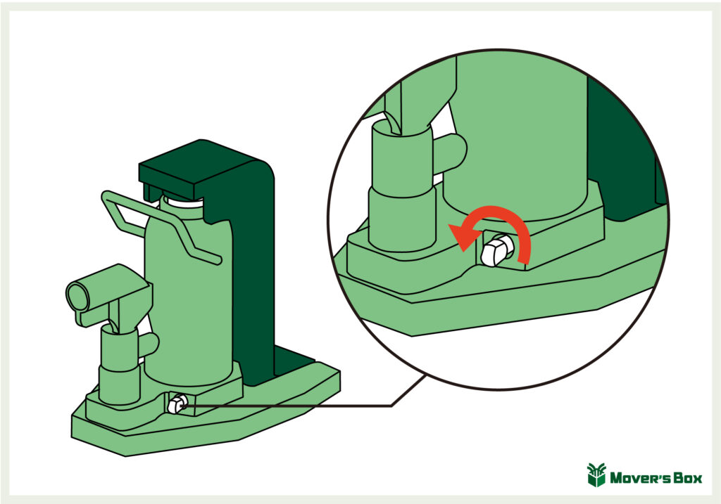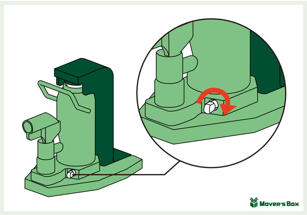 まずは、ベース付近にある開放弁を締め込みます。ここを締めることで、油圧回路内の空気の入り口を遮断することでき、ジャッキ内の回路が密閉状態となって圧が立つようになります。ジャッキの使用に慣れていない方の場合、この開放弁を締め忘れる方が多いです。ここを締め忘れるとラムシャフトが上昇しないので、お忘れなく!