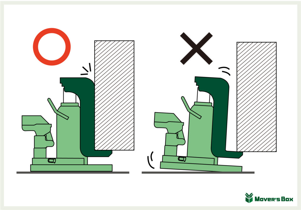 ワークに爪を掛ける時は、必ず爪の背板が対象物にピッタリ当たるように爪を奥まで差し込んでください。爪の先端だけにワークが掛かった状態だと、ジャッキが傾いたり、ベース部分や爪が変形するなどして、ワークの落下事故にも繋がりますので、絶対におやめ下さい。また、爪への先端掛けは、シリンダかじりの原因の1つでもあります。シリンダに傷がつき故障不能になる可能性も高くなるので、注意しましょう。